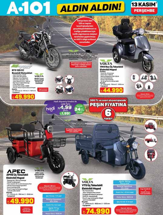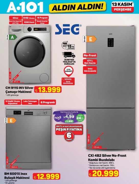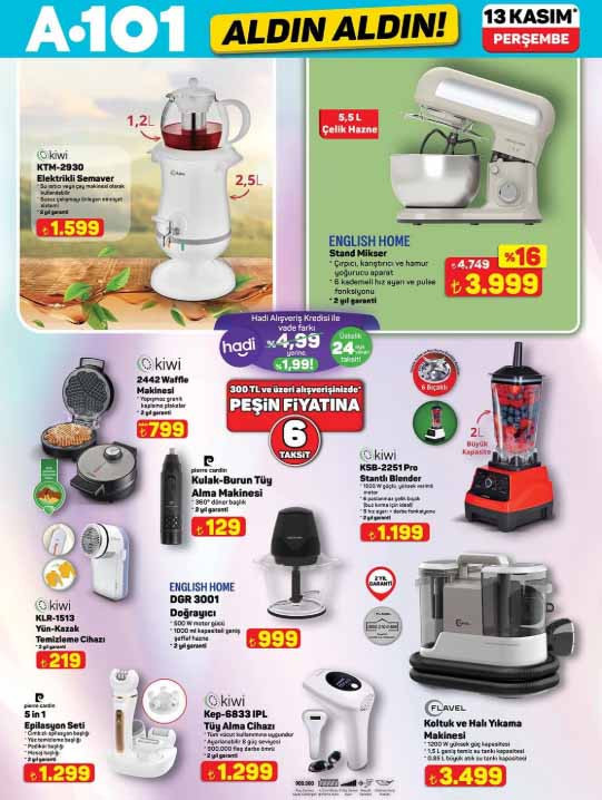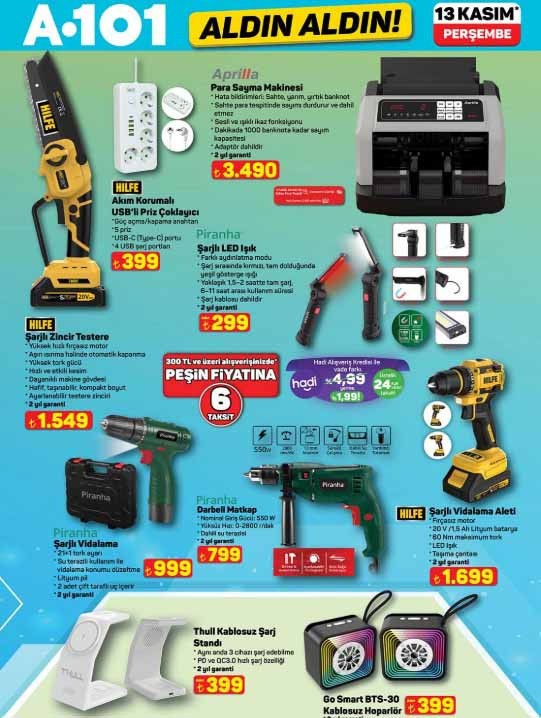 A101 aktüel afişi ile yepyeni katalog ürünleri satışa sunuluyor. 13 Kasım 2025 A101 Aldın Aldın indirim broşürü, spor aletleri, para sayma makinesi ve diğer elektronik gereçlerle dikkat çekiyor. A101 indirim broşürü içerisinde bu hafta; 43″ FHD Android LED TV 8.499 TL, direnç lastikli egzersiz aleti 1.699 TL, tüy alma cihazı 1.299 TL, yün-kazak temizleme cihazı 219 TL, üç tekerlekli elektrikli moped 74.990 TL, doğrayıcı 999 TL, standlı blender 1.199 TL, eliptik kondüsyon bisikleti 6.999 TL, 28 cm duvar saati 179 TL, döküm tost makinesi 599 TL, pasta tabağı adet 89,50 TL, Inox bulaşık makinesi 12.999 TL ile raflara gelmeye hazırlanıyor. A101 bülten ürünleri Perşembe günü satışa hazır olarak raflarda müşterileri bekleyecek. Peki A101 afişi bu hafta ürünleri neler? İşte 13 Kasım 2025 Perşembe A101 Aldın Aldın kataloğu tamamı…